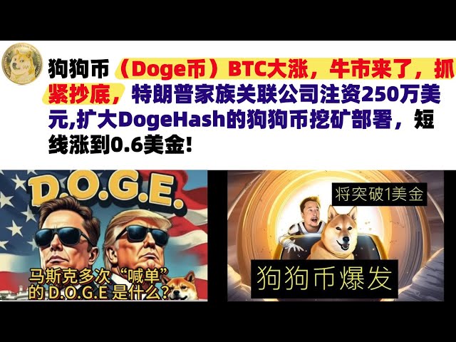 • 狗狗币(Doge币)BTC大涨,牛市来了,抓紧抄底,特朗普家族关联公司注资250万美元,扩大DogeHash的狗狗币挖矿部署,短线涨到0.6美金#DOGE币#马斯克狗狗币#DOGE行情分析