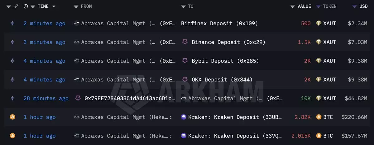 Abraxas Capital 存入 4,835 $BTC (3.78 亿美元)至#Kraken和 6,000 $XAUT ($28M)在过去一小时内#Binance 、 #Bybit 、 #OKX和#Bitfinex 。 https://intel.arkm.com/explorer/entity...